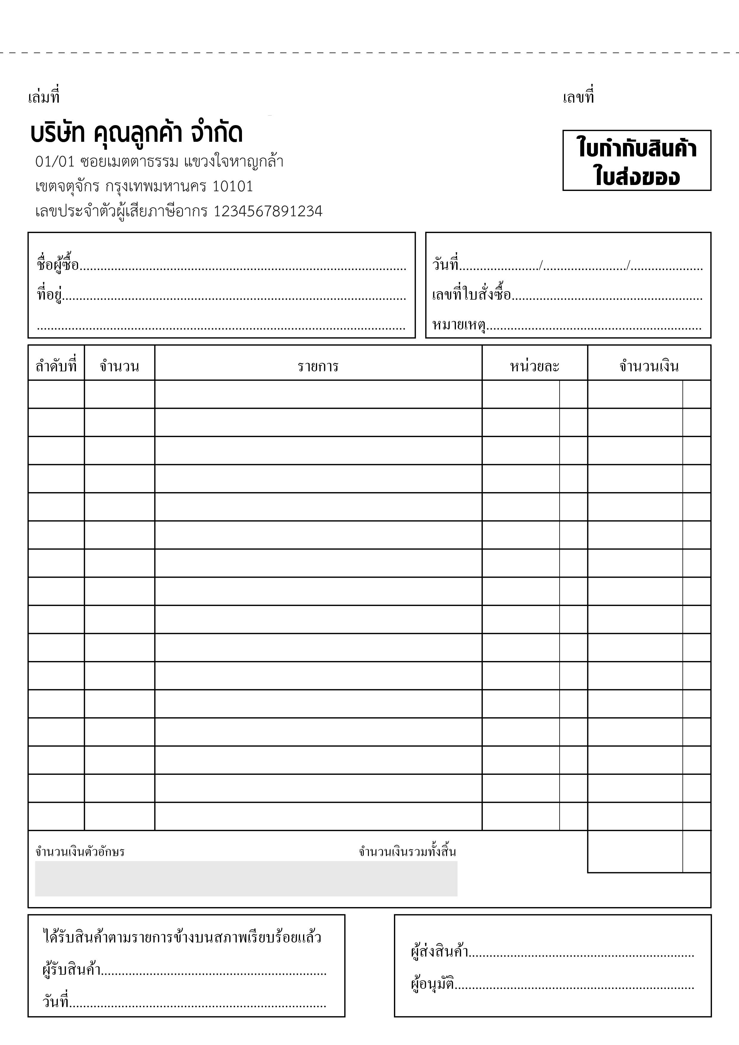 เคล็ดลับ: เพิ่มช่อง “หมายเหตุการจัดส่ง” หรือ “เงื่อนไขการรับคืนสินค้า” จะช่วยให้เอกสารดูเป็นมืออาชีพและลดปัญหาหลังการขาย