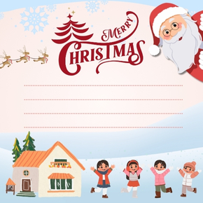 ดีไซน์อบอุ่นสไตล์การ์ตูน แสดงบรรยากาศหมู่บ้านในคืนคริสต์มาสที่เต็มไปด้วยรอยยิ้มของเด็ก ๆ เหมาะกับครอบครัวและกิจกรรมในโรงเรียน