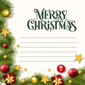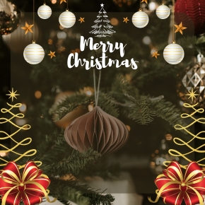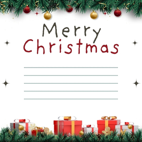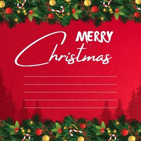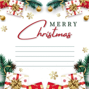 ขอบการ์ดตกแต่งด้วยของขวัญและใบสนรอบด้าน ให้ความรู้สึกครอบคลุมเต็มพื้นที่