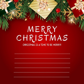 ใช้พื้นหลังแดงเข้ม ตัดกับกล่องของขวัญและใบสนสีทองด้านบน